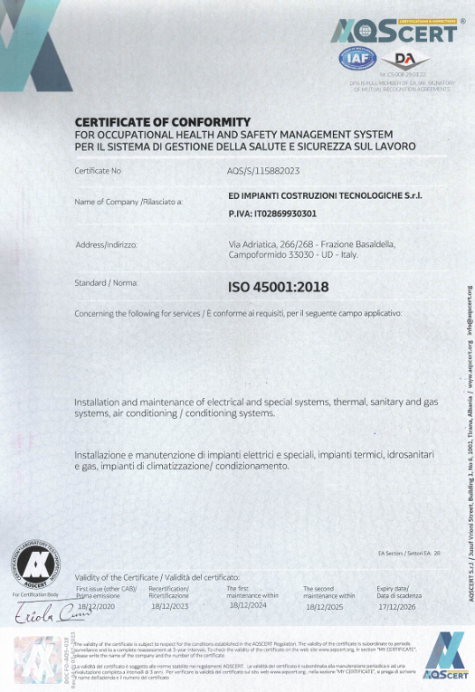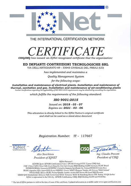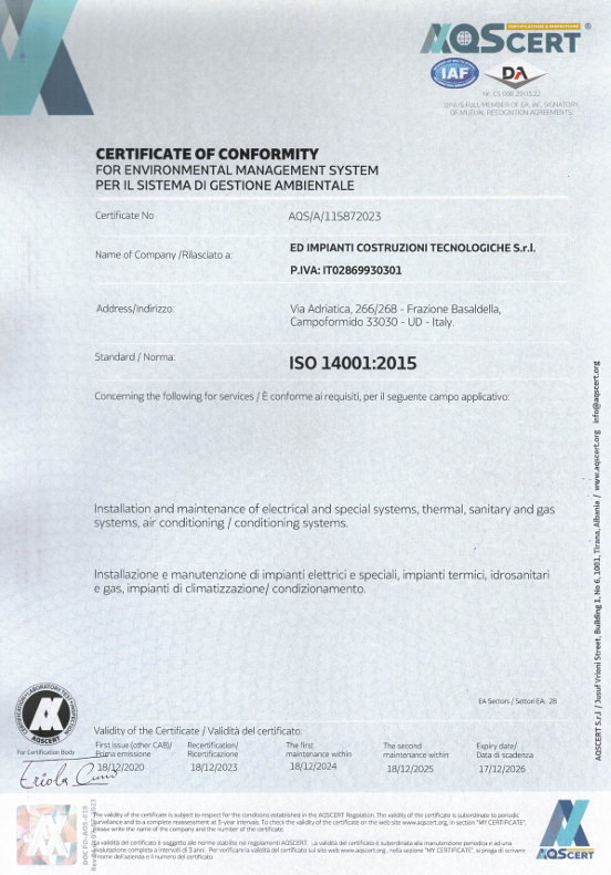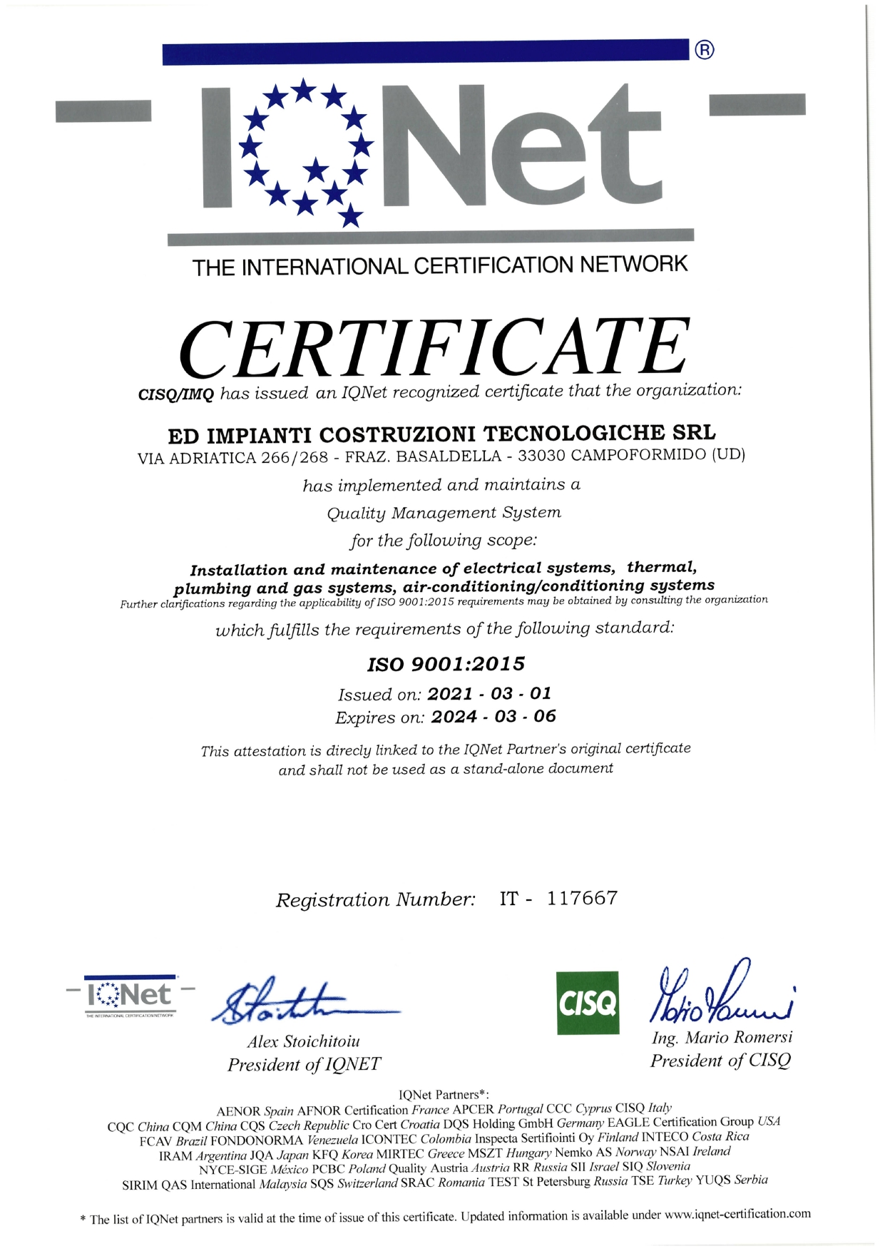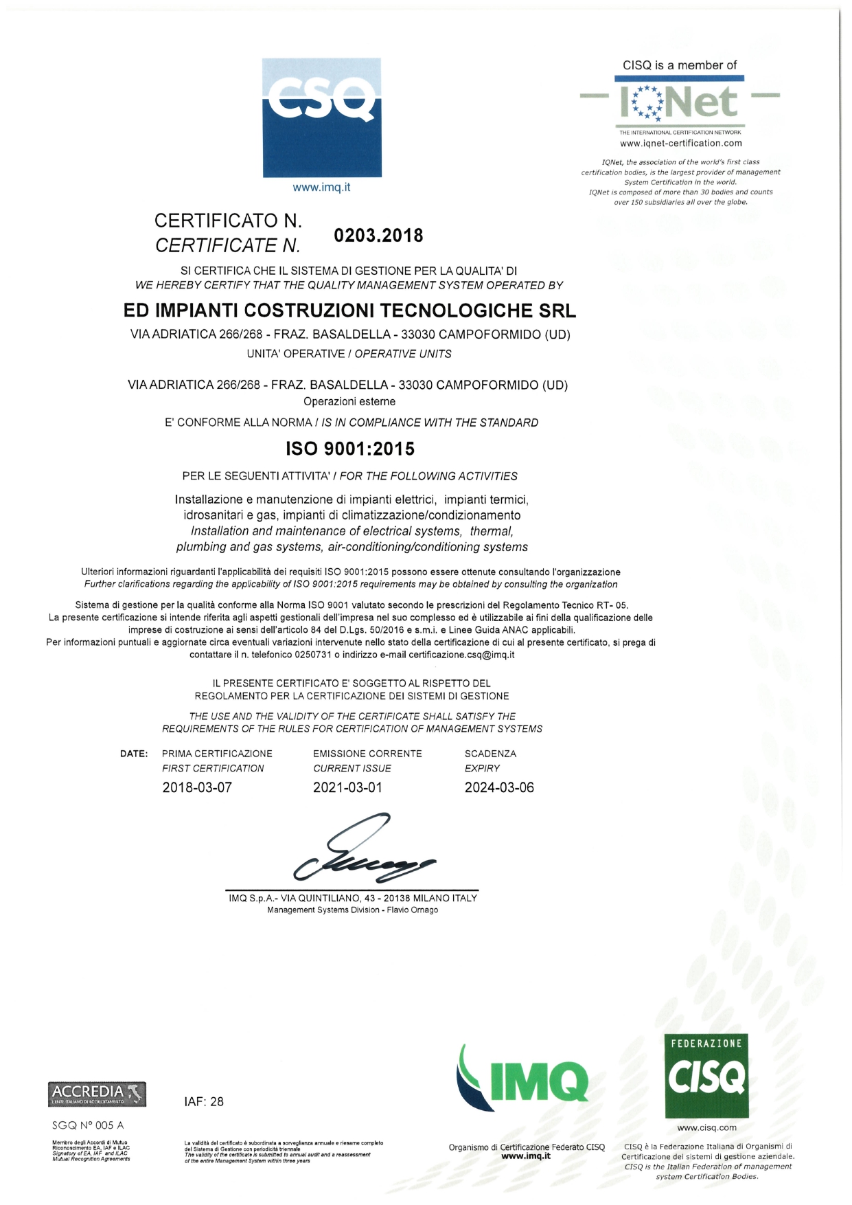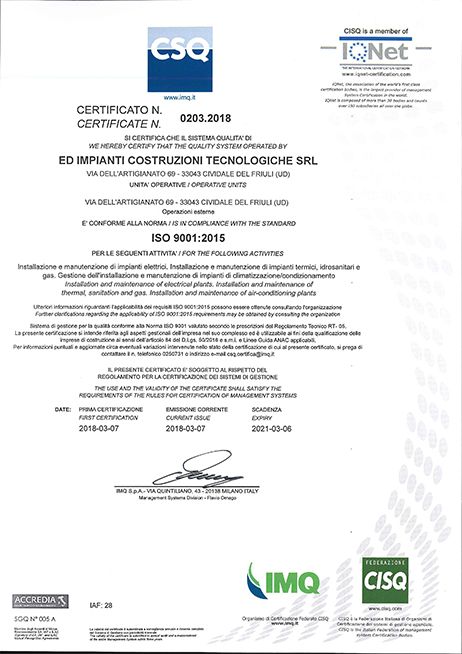 La qualità per i nostri clienti. La sicurezza per i nostri collaboratori. Per tutte le persone importanti, da sempre ED Impianti Costruzioni Tecnologiche Srl sta al passo con le più recenti normative in fatto di controllo della qualità, della sicurezza sul lavoro e della gestione ambientale. Non solo regole, ma delle vere e proprie vie da seguire nella nostra continua tensione verso il migliore dei risultati.
