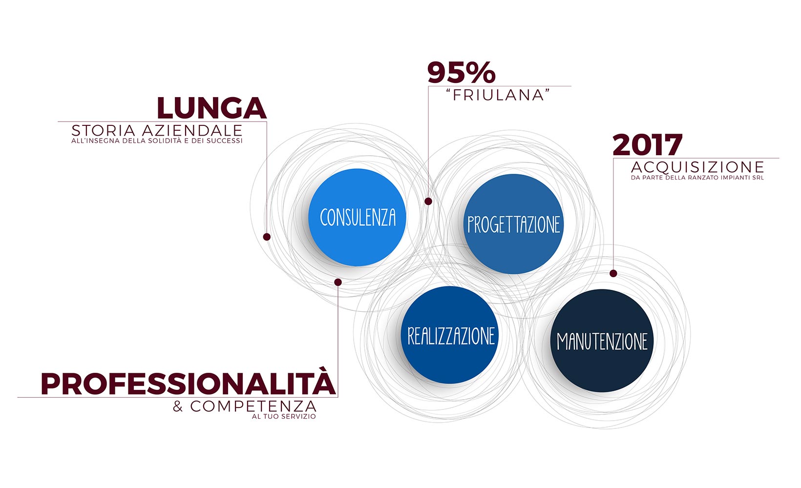 Tra i progetti in fase di completamento, vi è la realizzazione del nuovo e significativo impianto fotovoltaico presso l'Aeroporto di Trieste a Ronchi dei Legionari (GO), in collaborazione con Ranzato Impianti Srl. Seguono il restauro energetico del cinema Visionario di Udine (PNRR) e l'adeguamento agli standard normativi dei servizi igienici di Casa Serena per conto del Comune di Pordenone. Continuiamo con i lavori per la realizzazione del nuovo complesso impiantistico per il trattamento dei rifiuti solidi urbani e dei rifiuti organici della NET SpA di Udine.